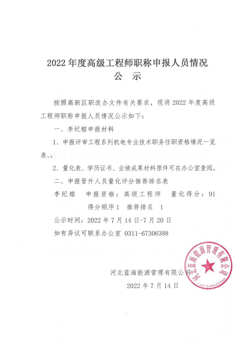 2022年度高级工程师职称申报人员情况公示